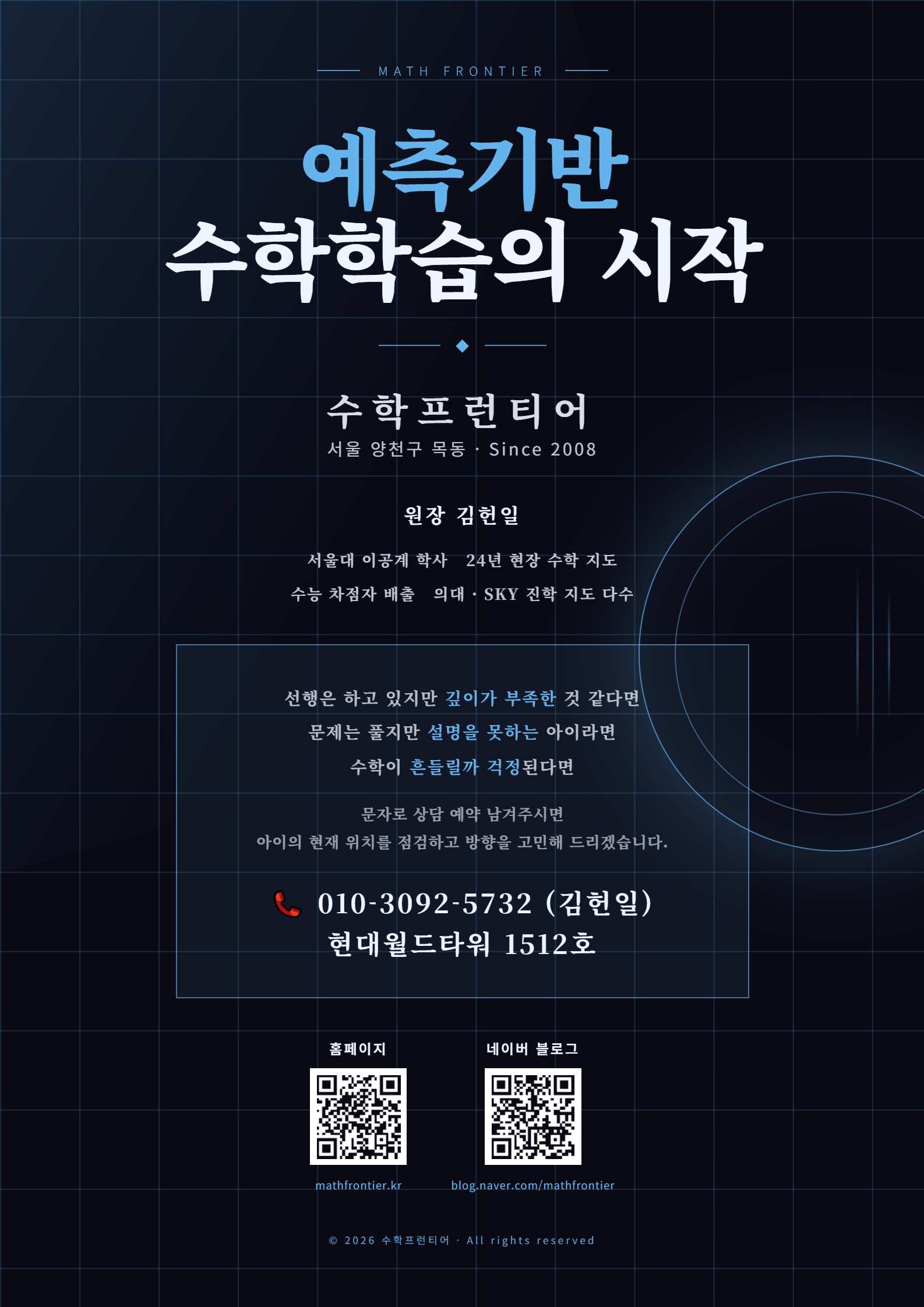 번호 제목 작성자 작성일 조회수 150 수학의 결정적 시기: 다가오는 수학 성적의 절벽 시기를 헤쳐 나가는 방법 수학프런티어 2026-03-16 63 149 [수학프런티어 고1] 예측기반 수학학습의 시작. 또 5등급에서 1등급이 되었습니다. 수학프런티어 2026-03-11 243 148 [수학프런티어 초5] 수학프런티어 초5 개강합니다. 수학프런티어 2026-03-02 398 147 초5·초6, 지금 수학의 경로를 결정할 시간입니다! 수학프런티어 2026-02-19 881 146 [수학프런티어 초4] 수학 5-1 개강했어요. 내년 2월엔 중학 수학1 시작해요. 수학프런티어 2025-06-05 4596 145 [수학프런티어 초3] 10년의 예측, 10년의 약속 수학프런티어 2025-03-23 5091 144 [수학프런티어 고1] 1등급 맞고, 대학가자! 수학프런티어 2025-02-15 5831 143 [수학프런티어 고2] 행복한 수학 공부! 공부양은 1/2배로! 성적은 2배로! 내신 1등급이 매우 쉬워졌습니다. 수학프런티어 2025-02-11 5766 142 [수학프런티어] 무료 수학학습 컨설팅을 받아보세요. 수학프런티어 2024-07-06 6209 141 [수학프런티어] 우리 아이 수학 공부에 대한 모든 솔루션을 제공합니다. 수학프런티어 2023-09-03 6636 140 [수학프런티어] 절대 틀릴 수 없는 데이타 기반의 수학 공부을 열었습니다. 수학프런티어 2023-08-03 6676 139 [수학프런티어] 선행학습의 리플리 효과 어떻게 할 것인가? 수학프런티어 2022-12-30 6957 138 [수학프런티어] 초등고학년 예비중1 입학 안내 수학프런티어 2022-10-21 7277 137 합리적 사고와 논리적 사고의 시작 초등 고학년을 위한 Frontier Semantics를 시작합니다. 수학프런티어 2022-08-01 7696 136 Frontier Semantics 수업(초5 대상)을 시작합니다. 수학프런티어 2022-07-19 7960 찾아가는 길 -