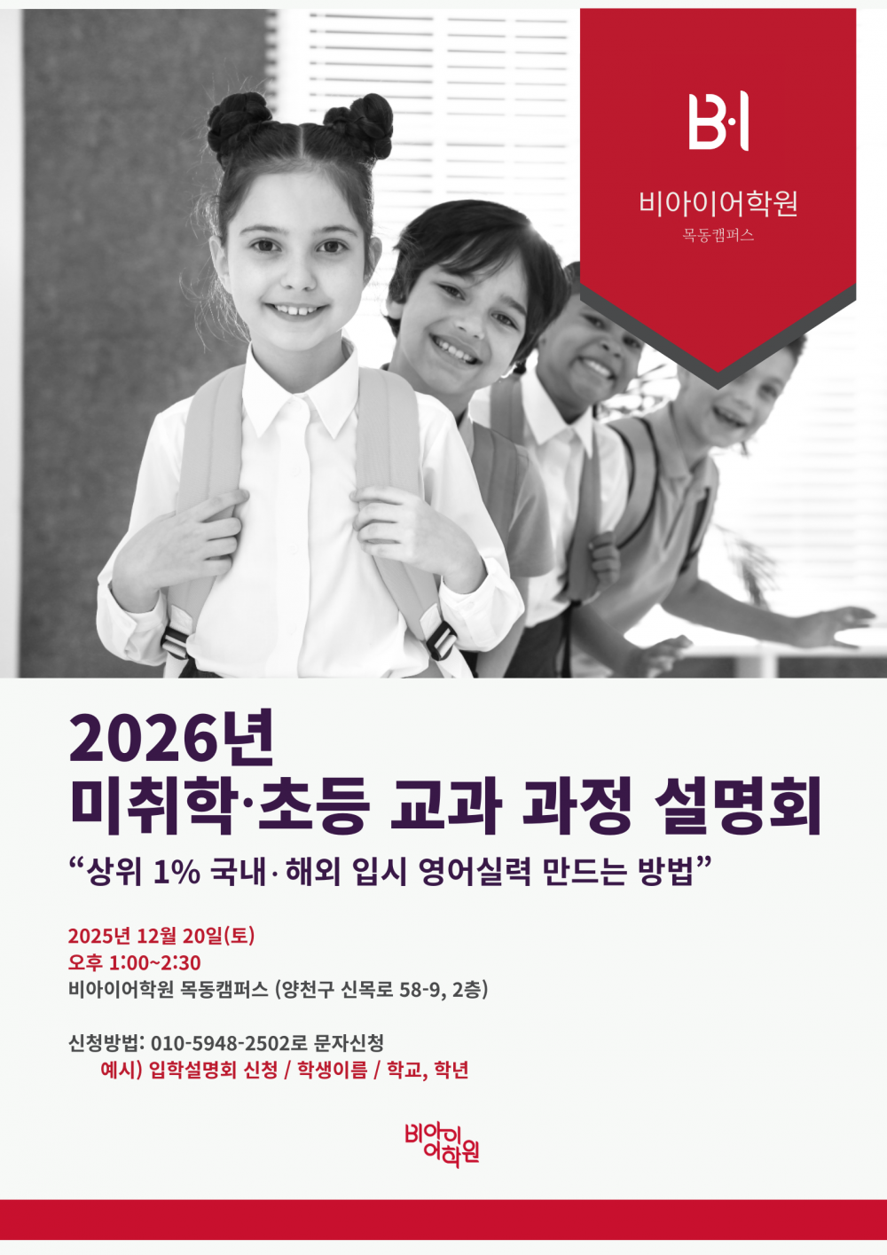 비아이어학원 초등부 입학설명회 안내 페이지 정보 작성자 비아이어학원 댓글 0건 조회 41회 작성일 25-12-16 16:54 본문 학원정보 비아이어학원 070-7726-2233 전화문의 위치 서울시 양천구 신목로 58-9 2층 대상 미취학 초등 중등 고등 과목 영어 수업목적 영재원/국제중 영재/특목/자율고 유학 지도보기 관심학원 담기 목록 다음글[아드폰테스 중고등방송회관] 2025 목일중 1학년 2학기 기말고사 내신분석 25.12.16 댓글목록 댓글목록 등록된 댓글이 없습니다.