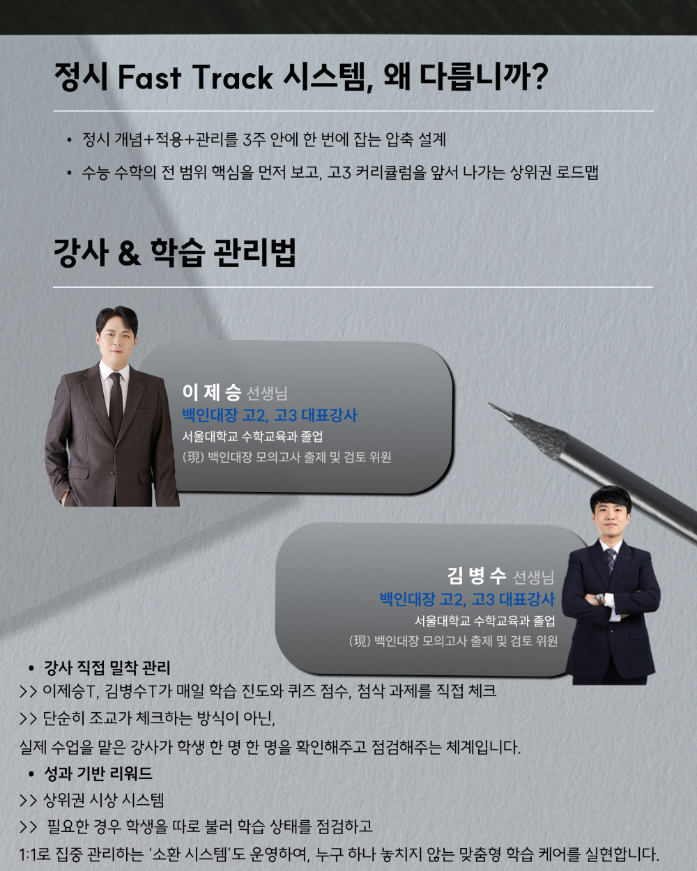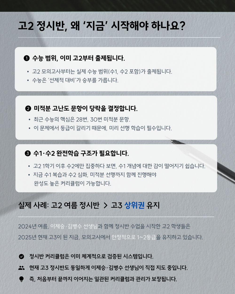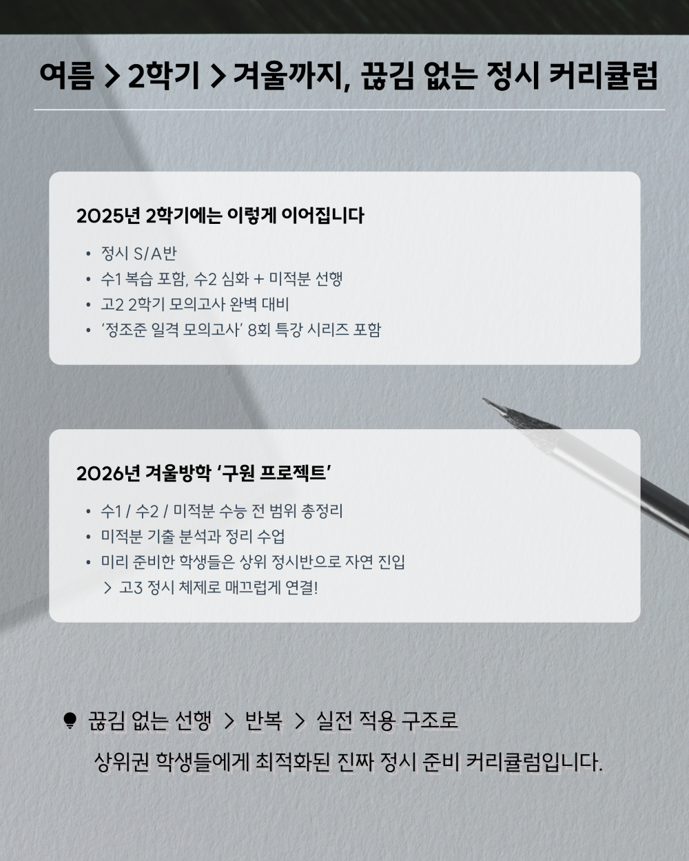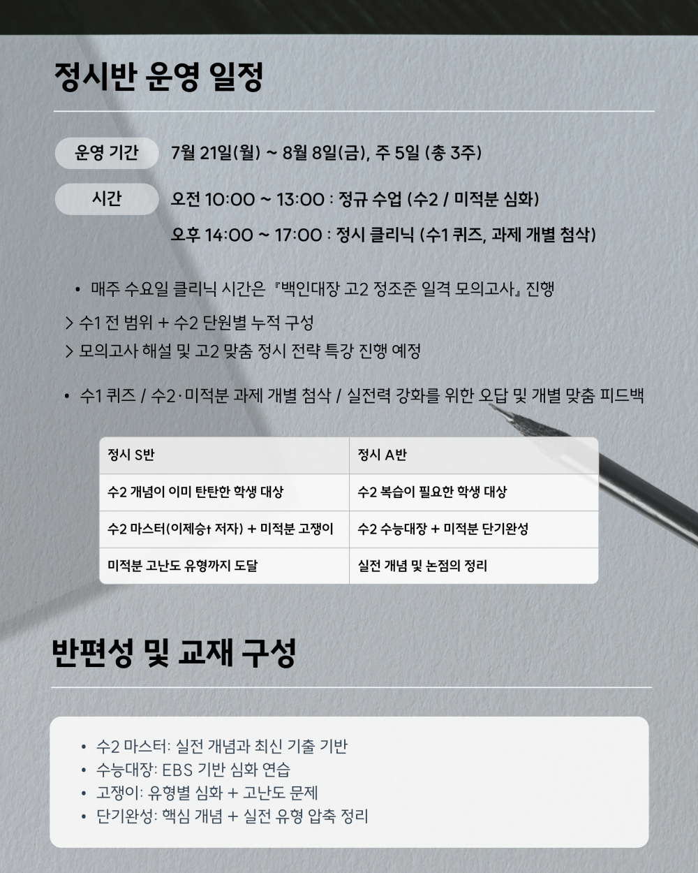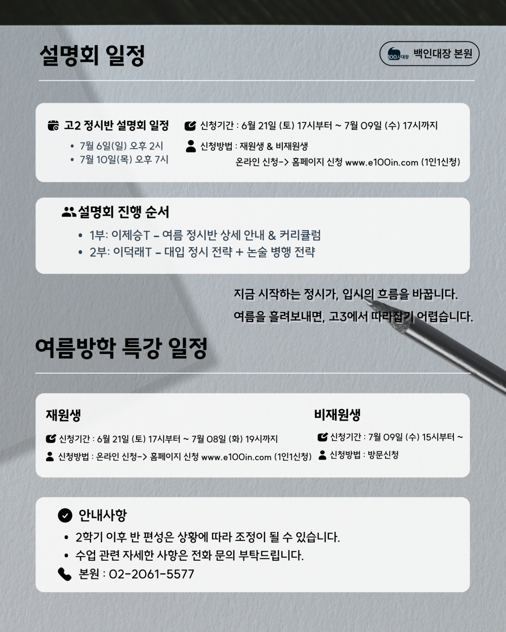 백인대장|고2 정시반 여름방학 특강 및 설명회 페이지 정보 작성자 백인대장SM학원 댓글 0건 조회 2,694회 작성일 25-06-19 20:08 본문 학원정보 백인대장 SM학원 02-2061-5577 전화문의 위치 서울시 양천구 목동동로 393 부영그린타운 1차 2층 대상 중등 고등 과목 수학 수업목적 내신/심화/선행 수능 지도보기 관심학원 담기 관련링크 https://www.e100in.com/e100in/home 1508회 연결 https://blog.naver.com/blog100in/223904993222 1512회 연결 목록 이전글백인대장|백인대장 본원, 훈련소(신정지점) 고3 설명회 25.06.20 다음글열린문수학 7월 신규반 시간표 안내 (VER. 0619) 25.06.19 댓글목록 댓글목록 등록된 댓글이 없습니다.