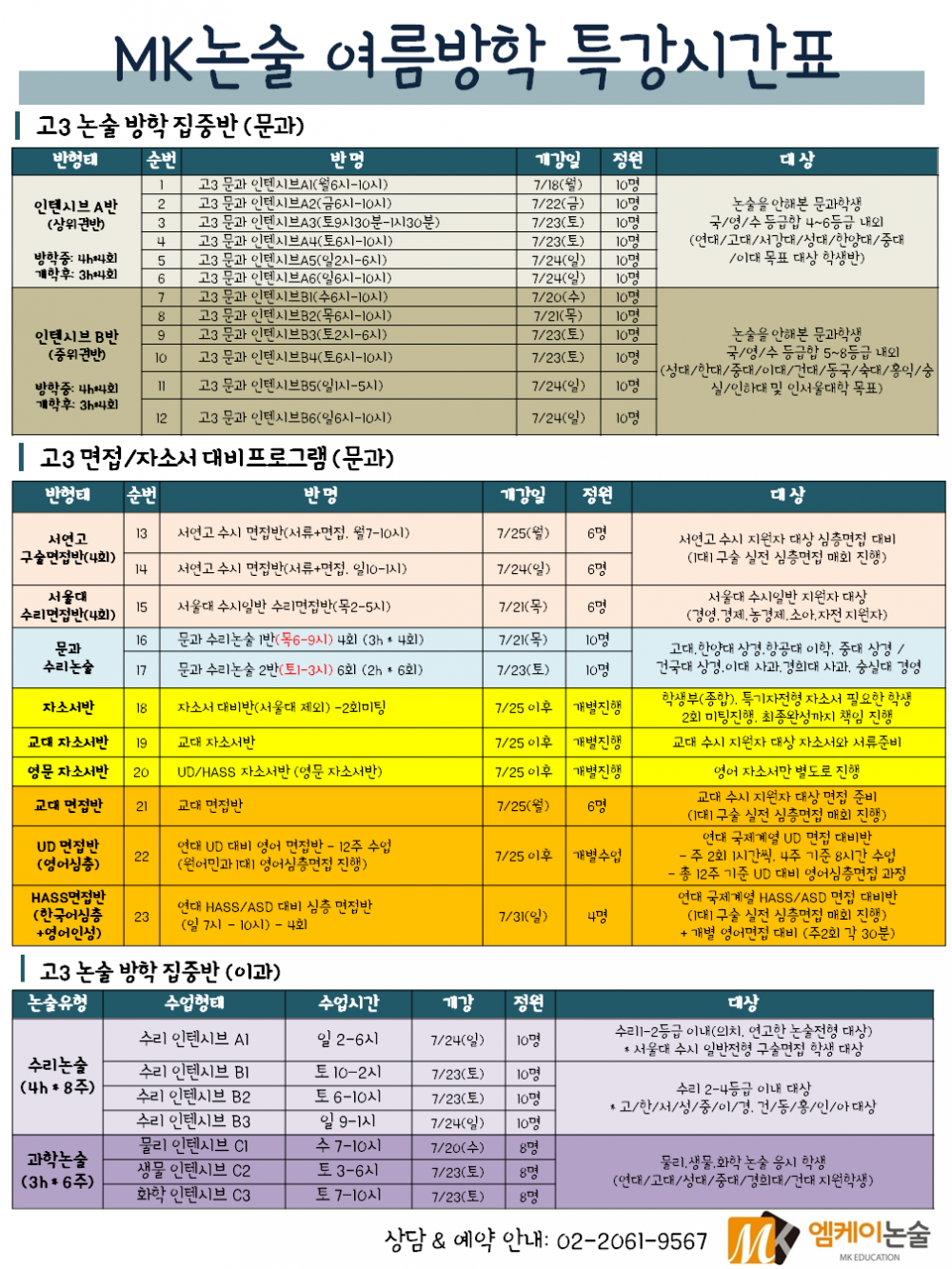 MK논술 2017수시대비 여름방학 특강개강 안내 페이지 정보 작성자 MK논술 댓글 0건 조회 4,690회 작성일 16-07-14 15:33 본문 학원정보 MK논술 02-2061-9567 전화문의 위치 양천구 목1동 408-115 목화빌딩 5층 대상 고등 과목 기타 수업목적 내신/심화/선행 수능 인문계비교과 자연계비교과 인강 기타 지도보기 관심학원 담기 목록 이전글[목동2에듀플렉스] 여름방학프로그램 16.07.15 다음글★[표현어학원] 여름방학 특강 시간표★ 16.07.13 댓글목록 댓글목록 등록된 댓글이 없습니다.