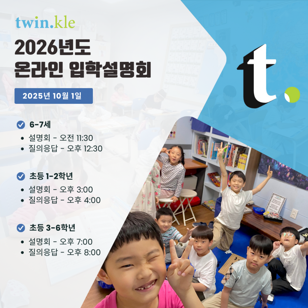 안녕하세요, 학부모님! 트윈클 2026년도 유치/초등부 온라인 설명회가 10월 1일(수) YouTube를 통해 공개됩니다!