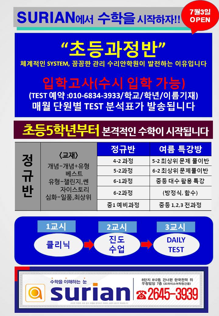 수리안 학원은 지난 중간고사때 목동/목운/봉영/목일중학교에서 90% 적중률을 보였습니다