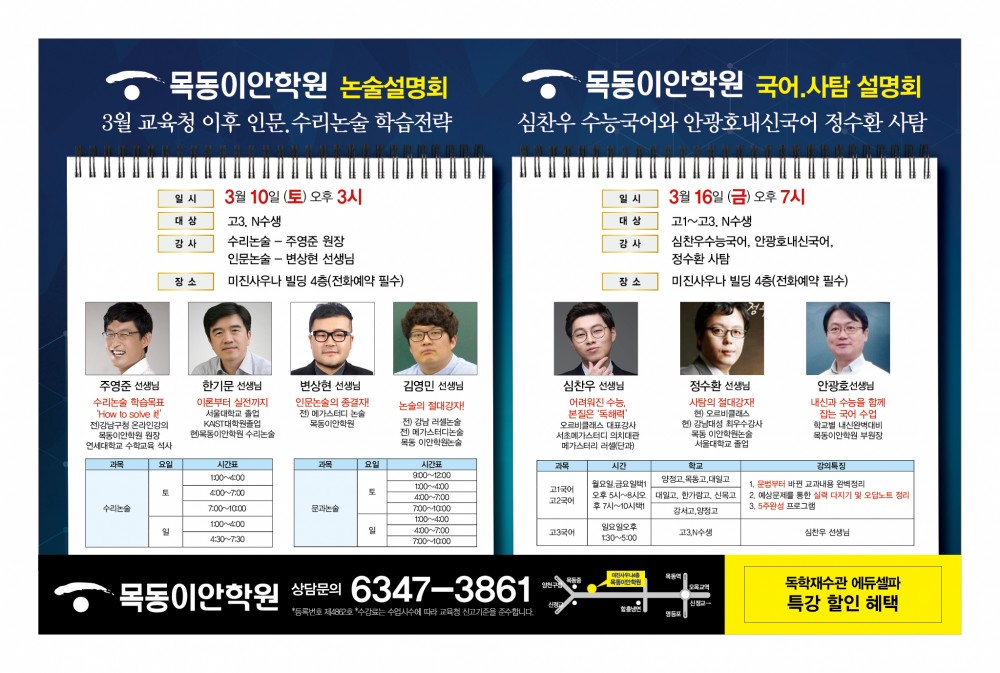 2차 설명회 내용: 고등부 국어 내신,수능/ 사회탐구 수능대비법 설명 대상: 고 1,2,3 날자: 3월 16일 (금) 시간: 저녁 7시 강사: 고등부 국어 - 안광호 선생님 심찬우 선생님 사탐 - 정수환 선생님 . |