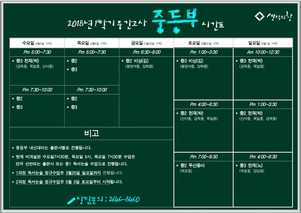 [2018 1학기 중간고사] 중2, 중3 내신대비 시간표