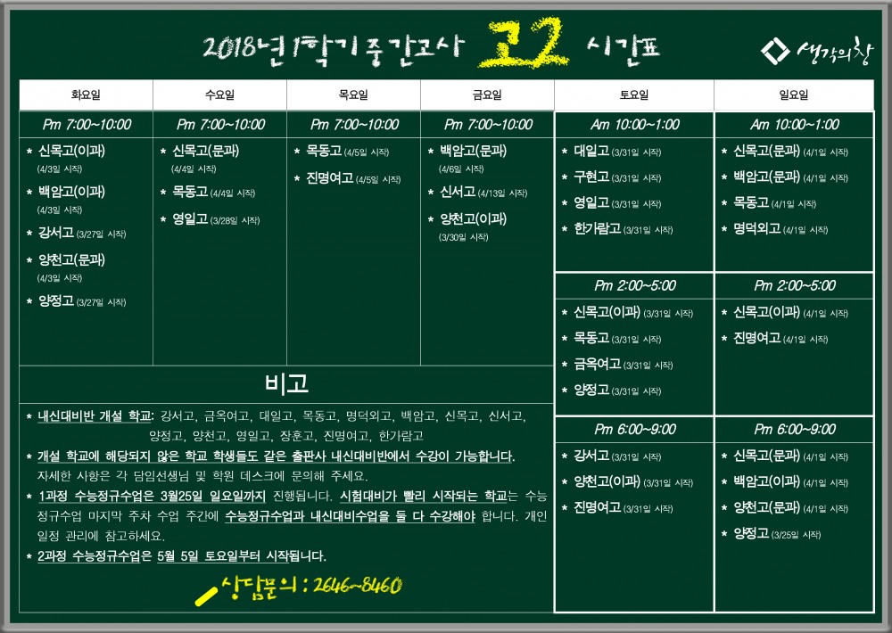 [2018 1학기 중간고사] 고2 내신대비 시간표(일정추가)