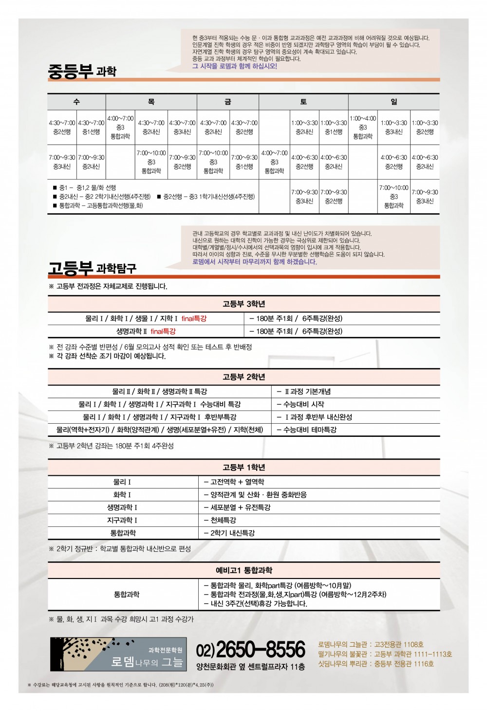 [로뎀과학학원] 중,고등부 여름방학 특강 개강 페이지 정보 작성자 로뎀과학학원 댓글 0건 조회 5,180회 작성일 18-06-21 17:01 본문 학원정보 로뎀과학학원 02-2650-8556 전화문의 위치 양천구 신정동 321 6센트럴프라자 11층 대상 중등 고등 과목 과학 수업목적 내신/심화/선행 수능 지도보기 관심학원 담기 목록 이전글[목동명인]고1 대입전략 및 여름방학 수업 설명회 18.06.21 다음글2018 에듀팰리스 여름 캠프 18.06.21 댓글목록 댓글목록 등록된 댓글이 없습니다.