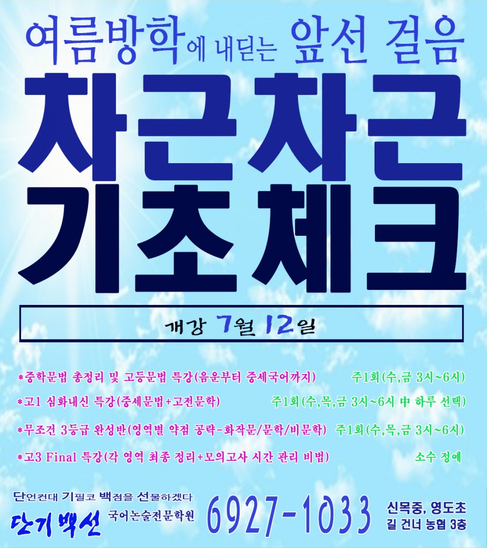 [단기백선 국어전문] 중등부 및 고등부 여름방학 특강 개강(7월 12일) 페이지 정보 작성자 단기백선국어전문학원 댓글 0건 조회 4,422회 작성일 18-07-03 22:32 본문 학원정보 단기백선국어전문학원 02-6927-1033 전화문의 위치 양천구 목동 중앙로 71 농협목동지점 3층 대상 중등 고등 과목 국어 수업목적 내신/심화/선행 수능 지도보기 관심학원 담기 목록 이전글★[사이언스캠퍼스]중등 여름방학시간표 및 입시전략설명회(선착순 마감주의) 18.07.03 다음글중1 여름방학 매일반 문법 단어 특강 18.07.03 댓글목록 댓글목록 등록된 댓글이 없습니다.
