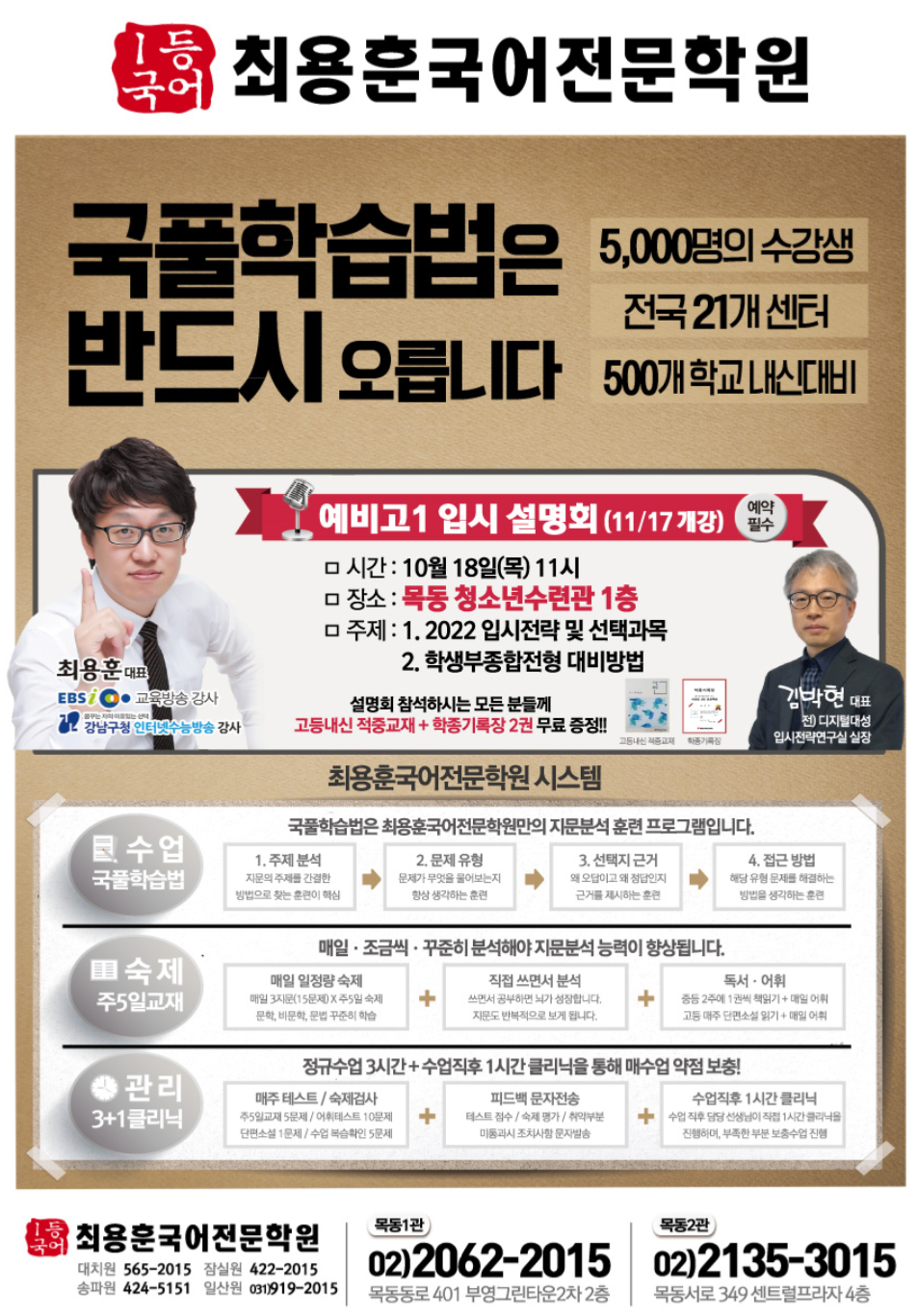 목동 최용훈 국어학원(부영2차 1관, 센트럴 2관)이 국내 최고의 입시 전문가 김박현 입시소장을 모시고 2022학년도 예비고1 입시분석과, 최용훈 대표의 국어 공부방법에 대한 귀중한 노하우를 배워보는 설명회를 개최합니다.