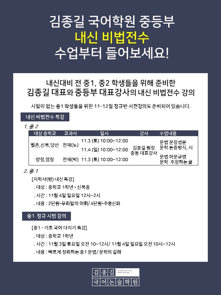 [김종길 국어학원 중등부 내신 비법전수! 수업부터 들어보세요!]