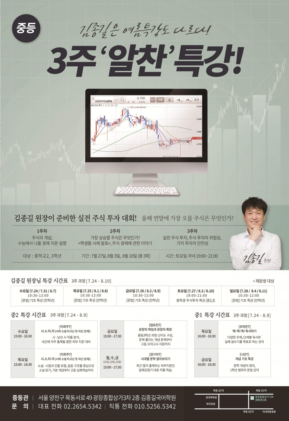 [중등] 김종길 원장 여름 3주 특강 페이지 정보 작성자 김종길국어중등부 댓글 0건 조회 4,723회 작성일 19-07-04 01:38 본문 학원정보 김종길국어 중등부 02-2654-5342 전화문의 위치 목동서로 49 광장3차 2층 3층 대상 초등 중등 고등 과목 국어 수업목적 영재/특목/자율고 내신/심화/선행 수능 지도보기 관심학원 담기 목록 이전글[고2] 미리 보는 2021 입시 설명회 19.07.04 다음글[택학원] 고등수학반 개강 안내입니다. 19.07.03 댓글목록 댓글목록 등록된 댓글이 없습니다.