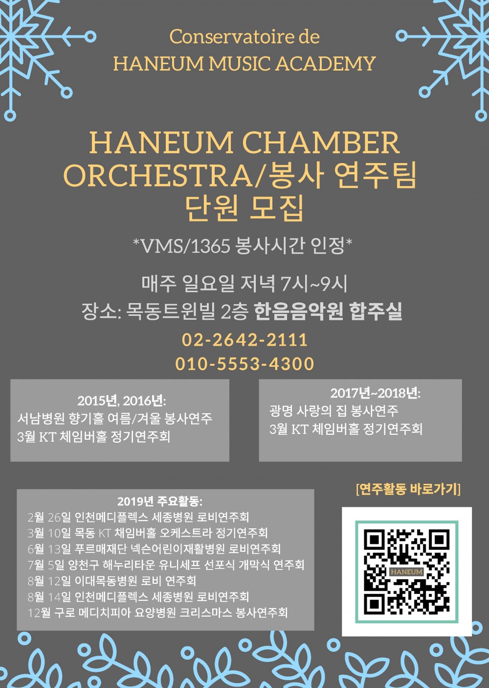 [한음음악원]한음 실내악 오케스트라/봉사연주팀(VMS, 1365봉사시간인정) 페이지 정보 작성자 한음음악원 댓글 0건 조회 4,385회 작성일 19-11-25 10:46 본문 http://blog.naver.com/jhflute2010 http://www.instagram.com/haneum_music_academy 학원정보 라비앙뮤직음악학원 02-2642-2111/ 010 5553 4300 전화문의 위치 양천구 목동 905 22목동트윈빌 2층 대상 초등 중등 과목 기타 수업목적 지도보기 관심학원 담기 목록 이전글[최용훈국어전문학원]겨울강좌 설명회 안내 19.11.25 다음글[한음음악원] 바이올린. 플룻. 클라리넷. 첼로 전문 음악원 19.11.25 댓글목록 댓글목록 등록된 댓글이 없습니다.