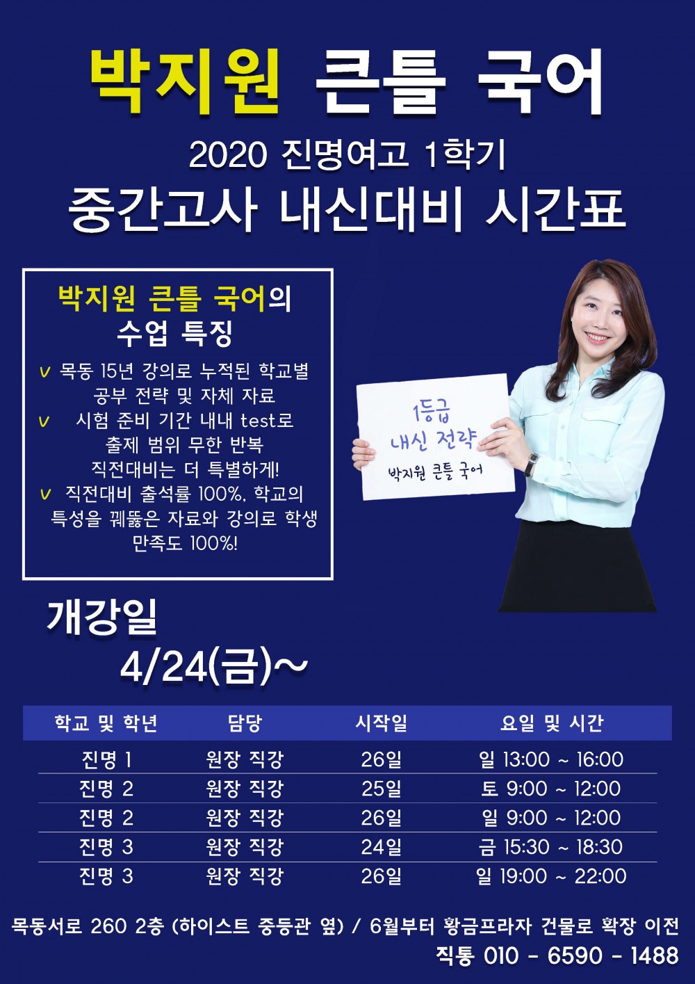 박지원 큰틀 국어 진명 전문반 1학기 중간고사 개강일 공지(각 학년별 개강) 페이지 정보 작성자 큰틀국어 댓글 0건 조회 5,171회 작성일 20-04-12 12:39 본문 학원정보 박지원 큰틀국어 010 6590 1488 전화문의 위치 서울 양천구 목동 서로 285 황금프라자 8층 대상 중등 고등 과목 국어 수업목적 내신/심화/선행 수능 지도보기 관심학원 담기 목록 이전글[PSK명문] 2020 대입수시 연세대/고려대 합격자 신목고 내신 경험담 20.04.12 다음글강서 플러스영어학원 내신시간표(수정본) 20.04.11 댓글목록 댓글목록 등록된 댓글이 없습니다.