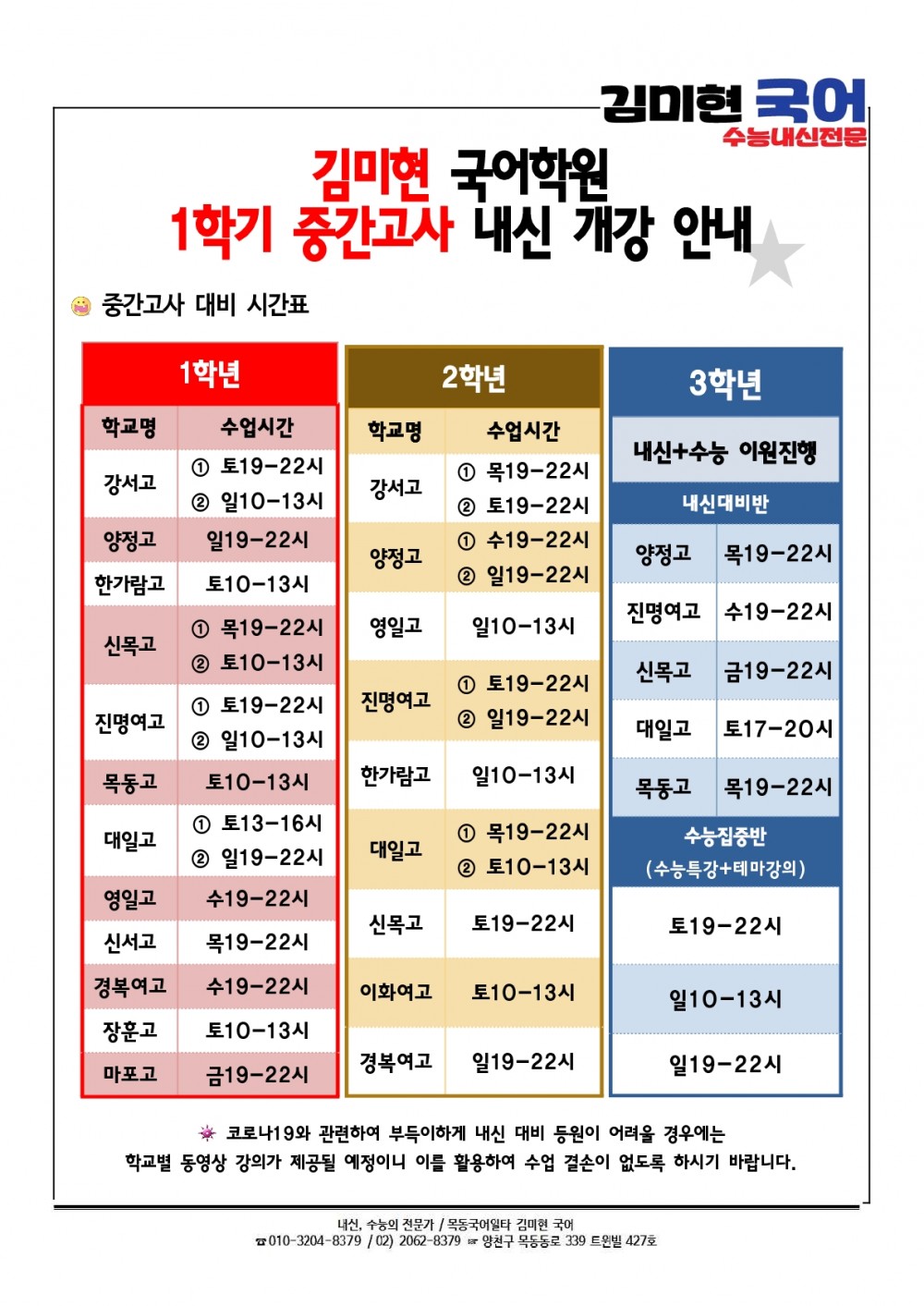 김미현국어학원 - 1학기 중간고사 내신대비 안내