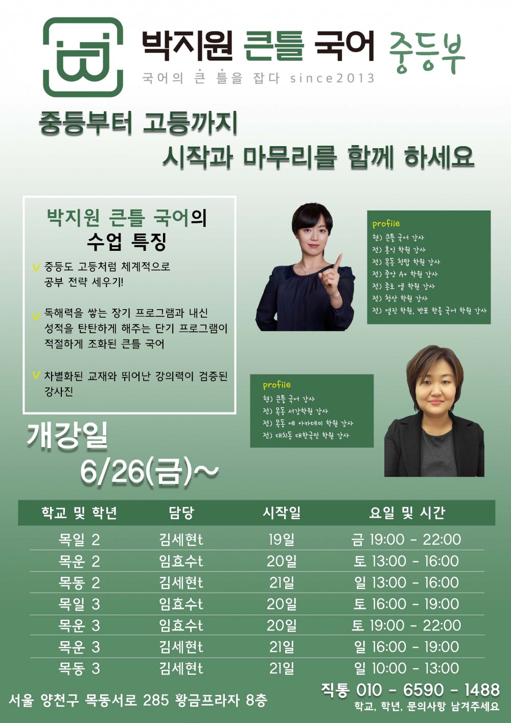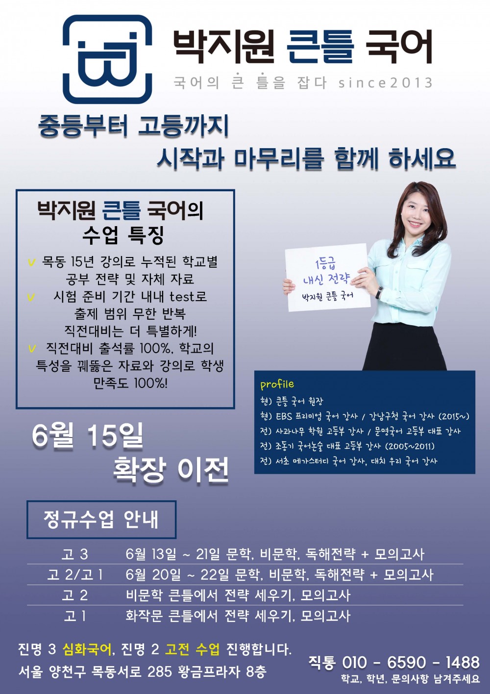 [박지원 큰틀 국어] 중등부 기말대비 내신 프로그램 안내 페이지 정보 작성자 큰틀국어 댓글 0건 조회 5,412회 작성일 20-06-13 15:39 본문 중등부는 독서 강화 프로그램은 기말고사 이후 설명회를 합니다. 학원정보 박지원 큰틀국어 010 6590 1488 전화문의 위치 서울 양천구 목동 서로 285 황금프라자 8층 대상 중등 고등 과목 국어 수업목적 내신/심화/선행 수능 지도보기 관심학원 담기 목록 이전글[김미현국어학원] 고1,2 기말고사 내신대비 시간표 안내 20.06.13 다음글[박지원 큰틀 국어] 정규 및 기말고사 내신 대비 고등부 프로그램 20.06.13 댓글목록 댓글목록 등록된 댓글이 없습니다.