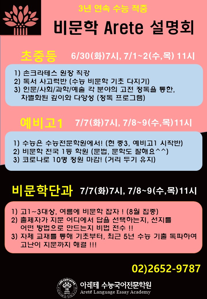 [비문학Arete설명회] 초중등 손크라테스 원장직강반/ 예비 고1 수능시작반 / 여름 비문학 단과 모집