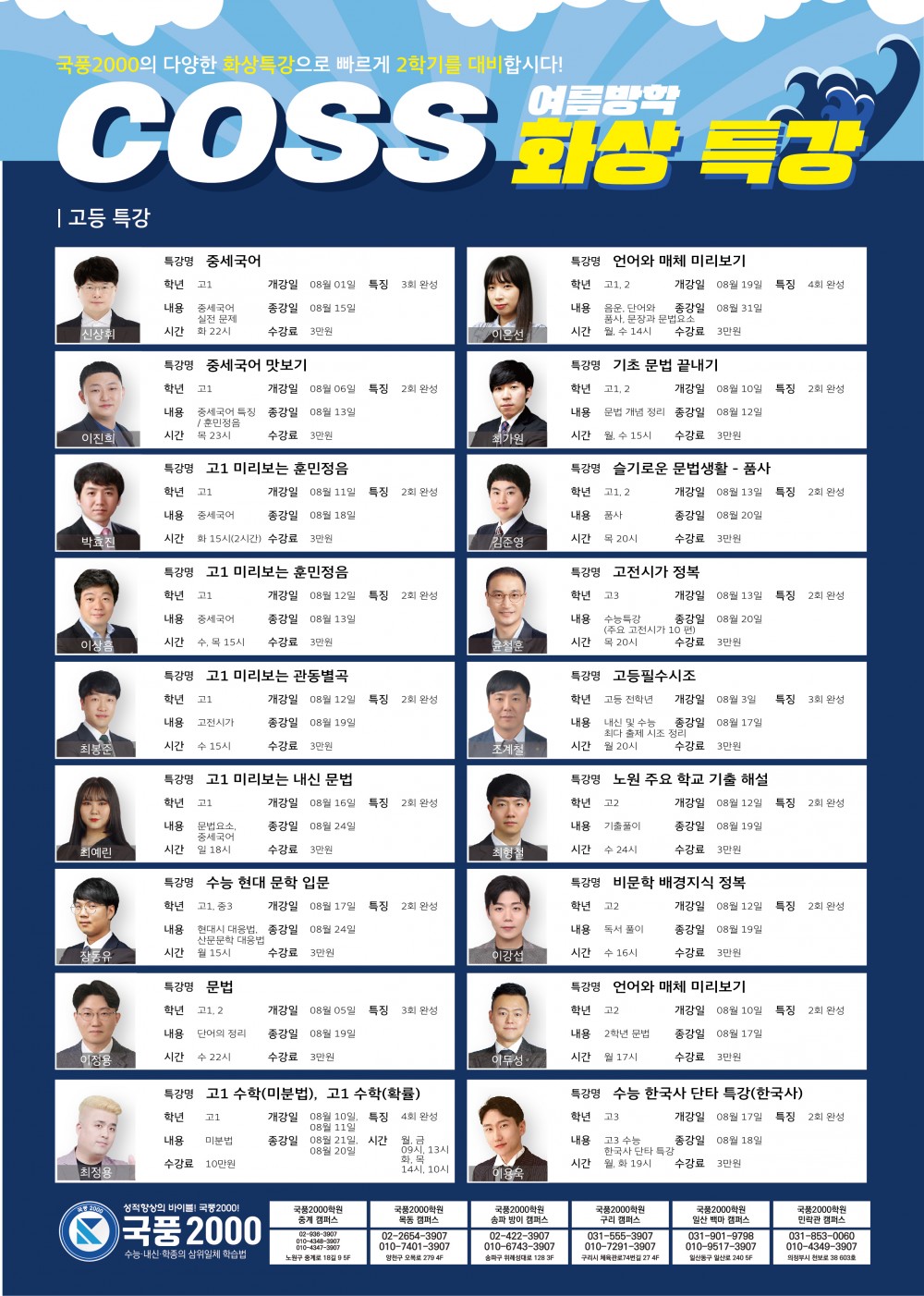 어긋난 학사일정으로 여름방학이 매우 짧게 진행됩니다. 이러한 상황에서는 우리 아이들의 학업성취도를 장담할 수 없고, 2학기 내신이 매우 어려워질 것으로 예상되기 때문에, 그에 대한 확실한 솔루션을 저희 국풍2000에서 준비했습니다~!