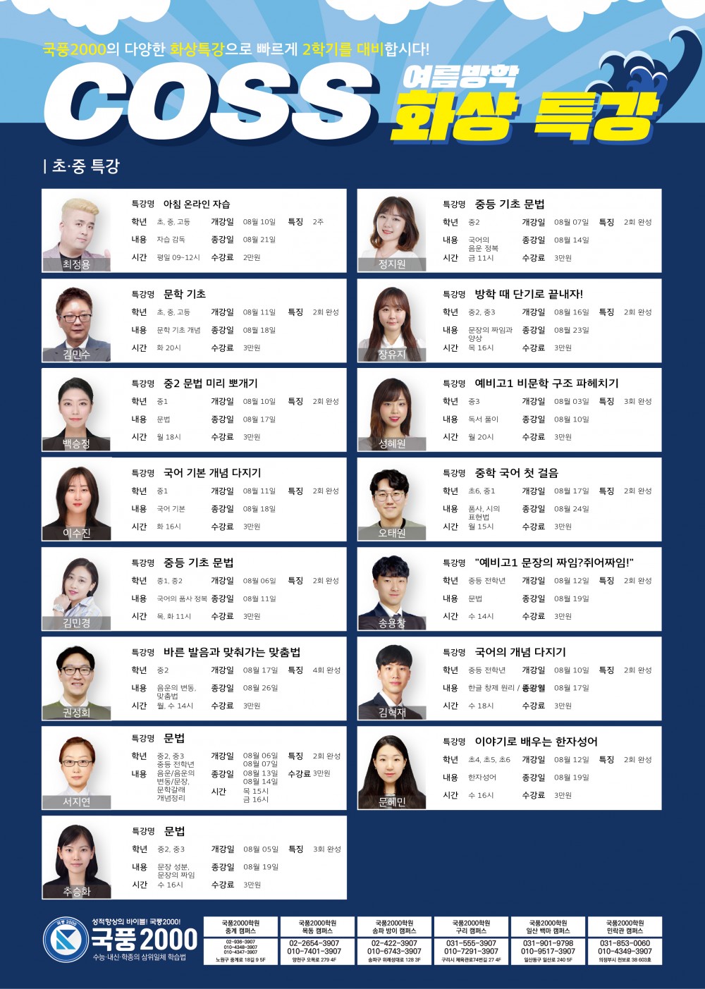 짧은 여름방학 다양한 국어 특강과 함께 2학기 내신을 미리미리 준비하시기 바랍니다. 엄청난 특강 수강료 혜택은 덤으로 경험하세요~!