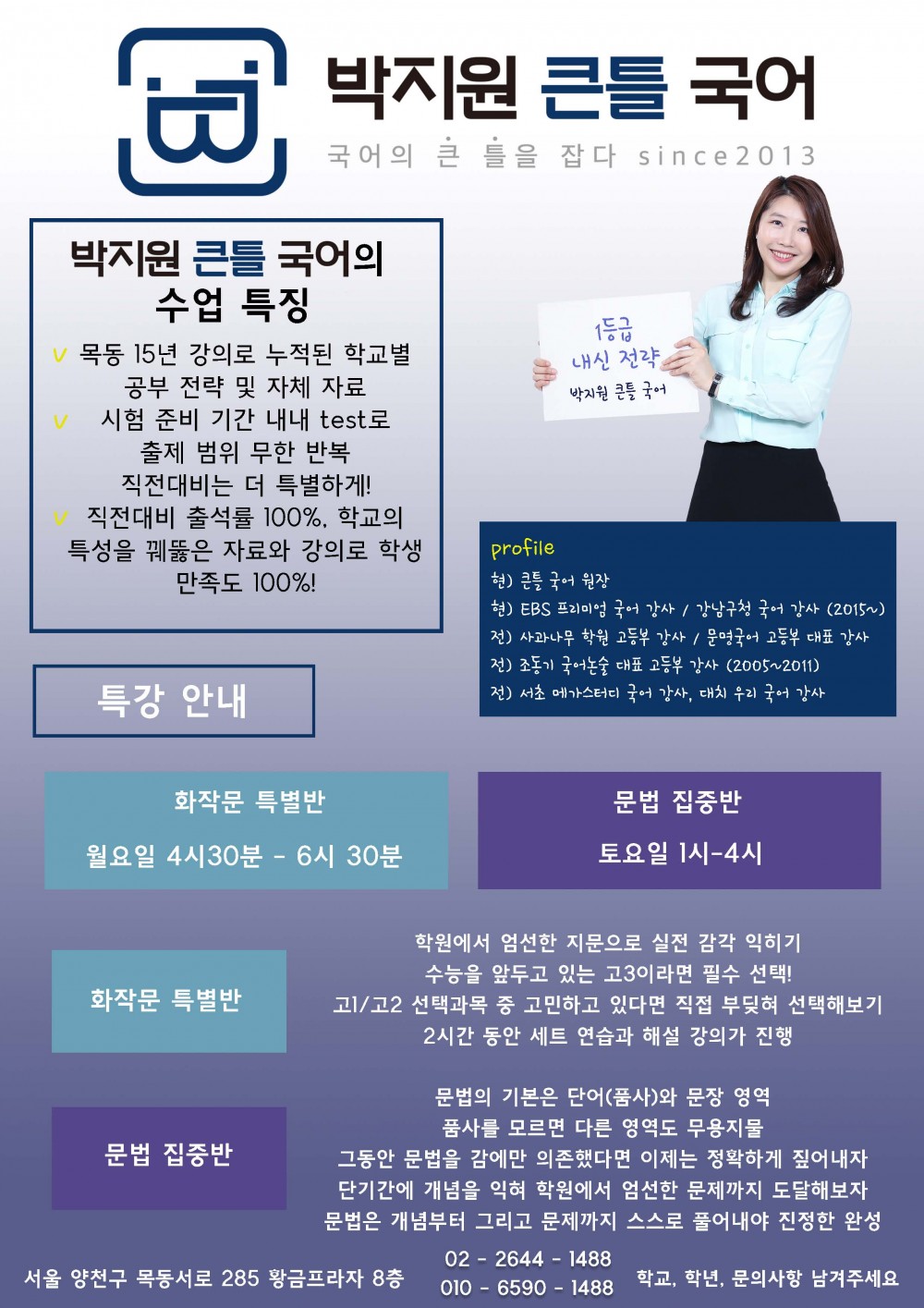 안녕하세요? 박지원 큰틀 국어입니다. 6월 15일을 기점 황금프라자 8층으로 확장 개원하게 되었습니다.