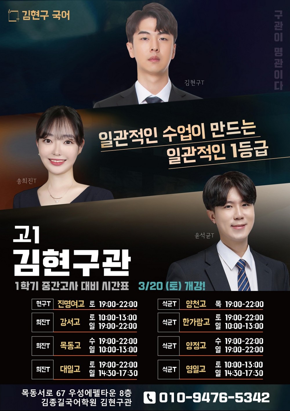 [김현구 국어] 고3 수능 정규 및 고1,2 내신대비 안내 - 2021학년도 합격자 명단. 오직 실력과 결과로 말한다! 페이지 정보 작성자 김종길국어학원 김현구관 댓글 0건 조회 4,744회 작성일 21-03-04 15:12 본문 http://hyun9.com 자세한 합격수기, 수강후기 김현구 국어 홈페이지에서 확인하세요 학원정보 김현구국어학원 010-2652-5430 전화문의 위치 서울특별시 양천구 목동동로 377 유니아나 2층 김현구국어학원 대상 고등 과목 국어 수업목적 수능 지도보기 관심학원 담기 목록 이전글[내가만난국어선생] 수능과 내신에 강한 학원! 중간고사 내신대비 개강! (3/17~) 21.03.04 다음글요즘 아이들이 뭘 배우면 좋을까요?^^ 21.03.04 댓글목록 댓글목록 등록된 댓글이 없습니다.