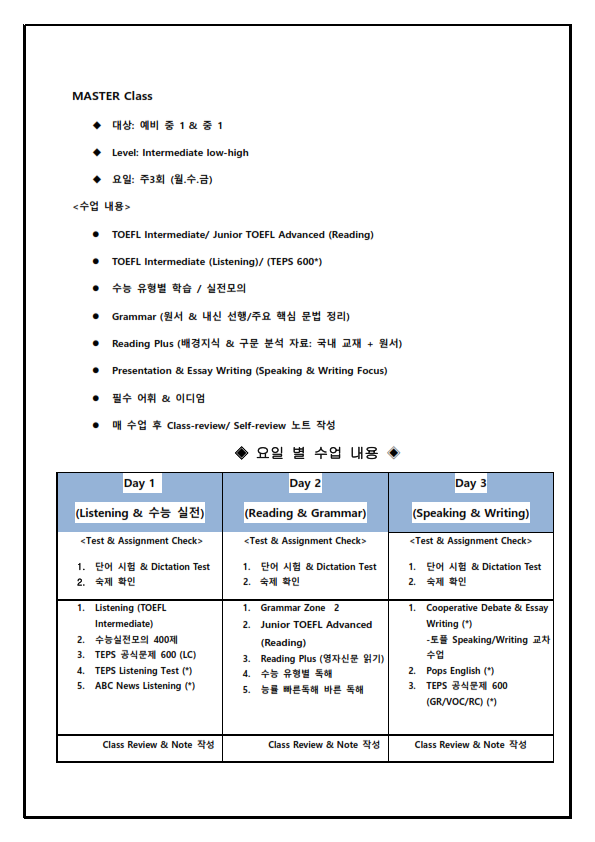 <텝스/토플/수능/내신 정규 프로그램 & 특강 프로그램 안내>