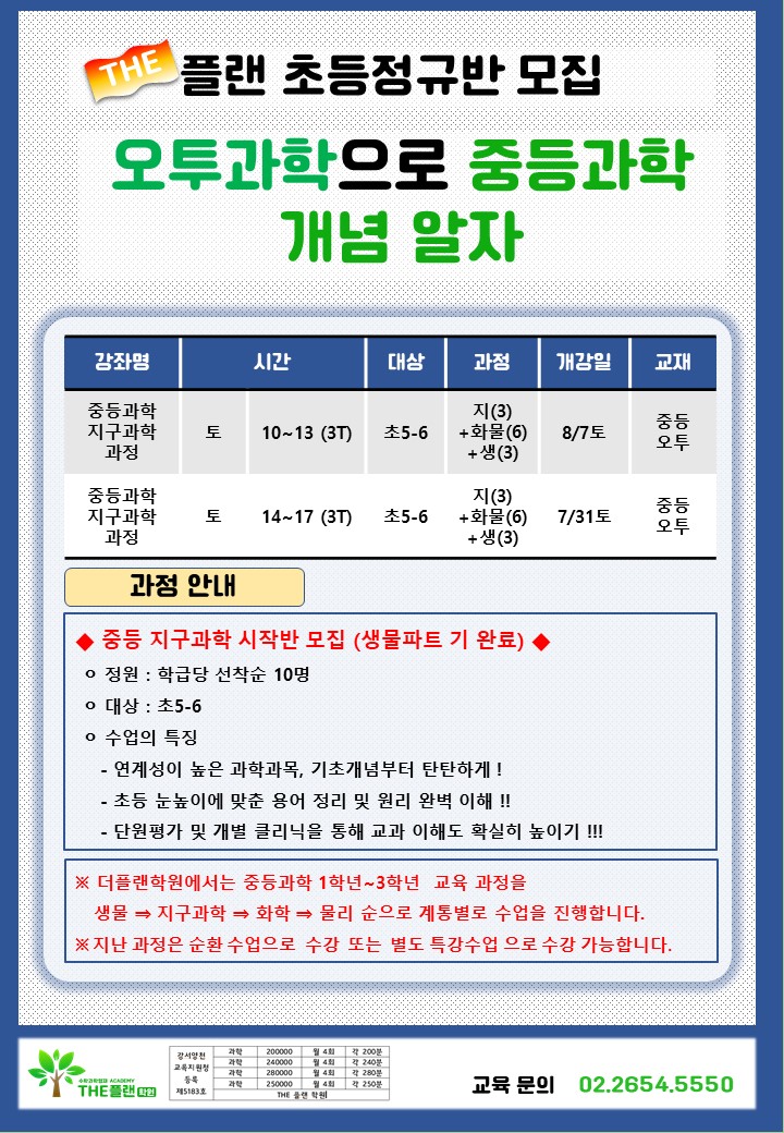 [더플랜학원]★THE플랜 과학 초등 오투정규반 모집★