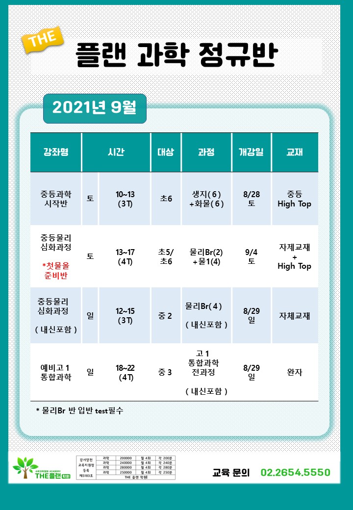 [더플랜학원] THE플랜과학 9월 정규반 모집 (중등과학시작반, 중등물리심화반, 예비고1 통합과학)