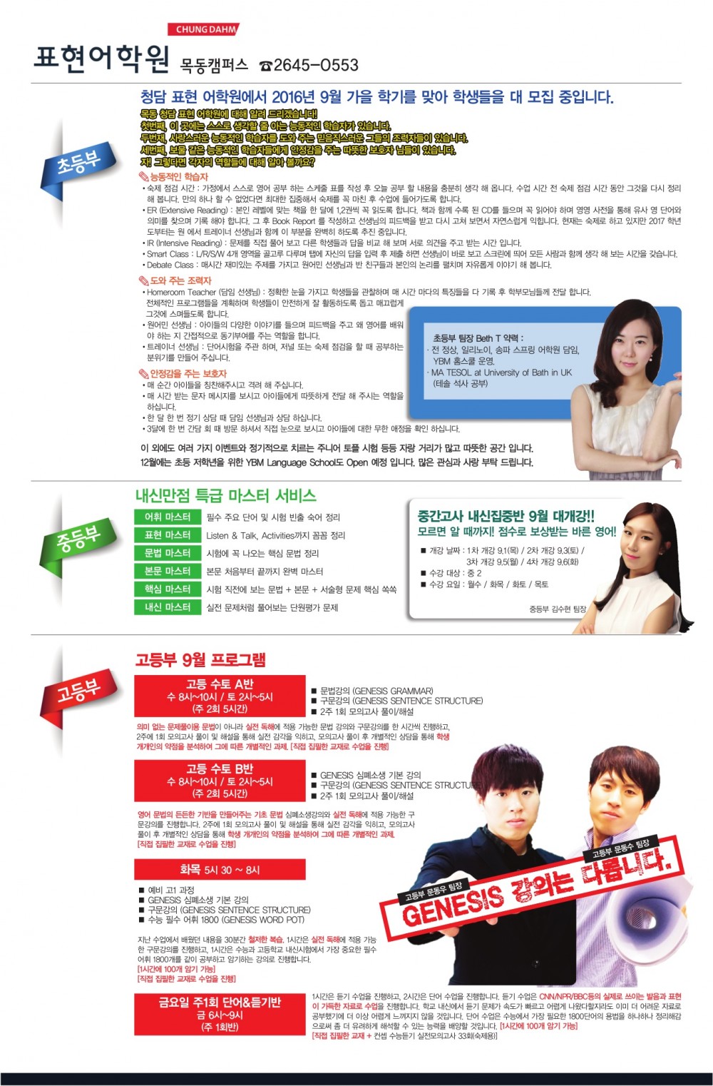2016년 가을학기 안내 페이지 정보 작성자 표현어학원 댓글 0건 조회 3,886회 작성일 16-08-06 10:45 본문 학원정보 청담표현어학원 02-2645-0553 전화문의 위치 양천구 오목로 279 현대프라자 4층 대상 초등 중등 과목 영어 수업목적 영재원/국제중 영재/특목/자율고 내신/심화/선행 수능 유학 지도보기 관심학원 담기 목록 이전글국풍2000 8월 행사 일정 16.08.07 다음글[페리온영어] EBS 커리어 진로적성진단 16.08.05 댓글목록 댓글목록 등록된 댓글이 없습니다.