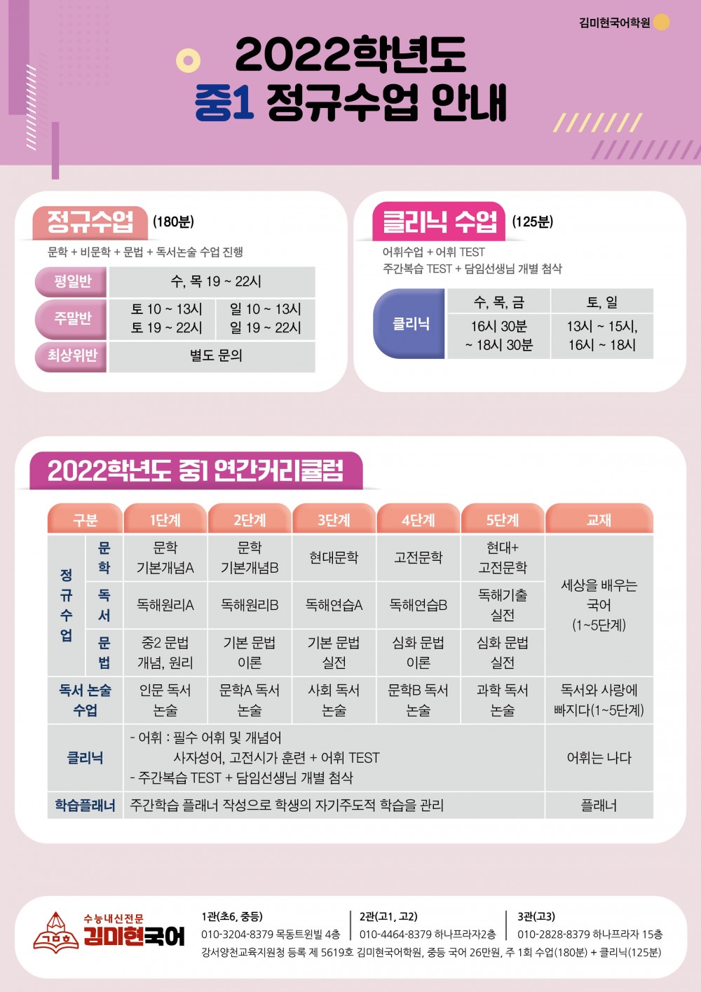 [김미현국어학원] 2022년 중1 연간 커리큘럼 안내(개강일: 1/5, 수 )