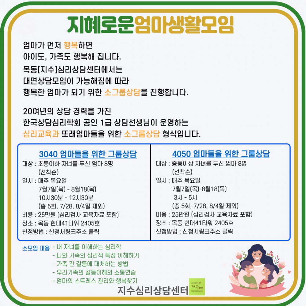 4050 엄마들을 위한 그룹상담 신청링크 : https://naver.me/F8B3BMOu