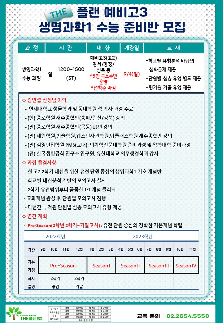 [더플랜학원]THE플랜 예비고3 생명과학1 수능 준비반 모집(★9/4(일) 개강)