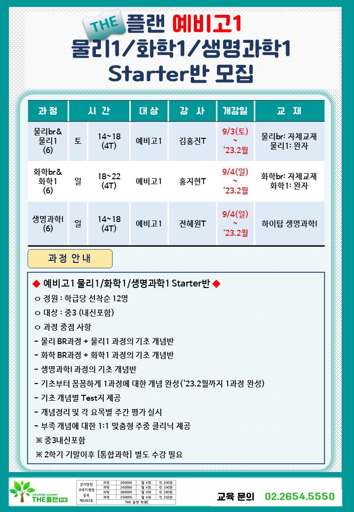 [더플랜학원]THE플랜 예비고1 물리1/화학1/생명과학1 Starter반 모집(★9/3,4개강)