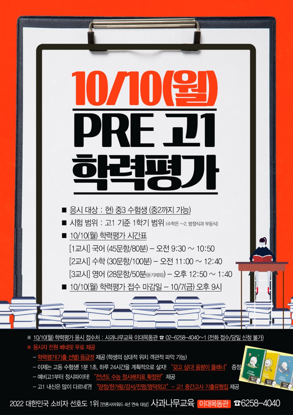 ■[중등] 10/10(월) PRE 고1 학력평가 시행 (접수 마감 : 10/7(금) 오후 9시까지)■[사과나무교육]