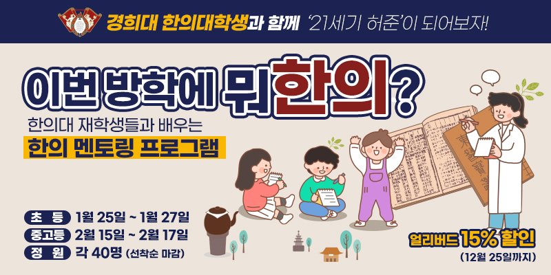 이번 겨울방학 한의학 캠프를 통해 경희대 한의생들과 한의사 진로체험을 하며 다양한 학습을 통해 스스로 문제를 해결해나가는 자기주도적 학생이 되어보아요!