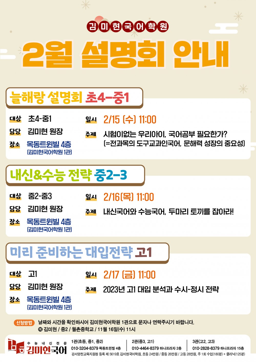 [김미현 국어학원] 늘해랑~고3, N수 정규수업 개강(2월) / 2월 설명회 / 고1 중간고사 대비 무료특강(비재원생 신청가능…