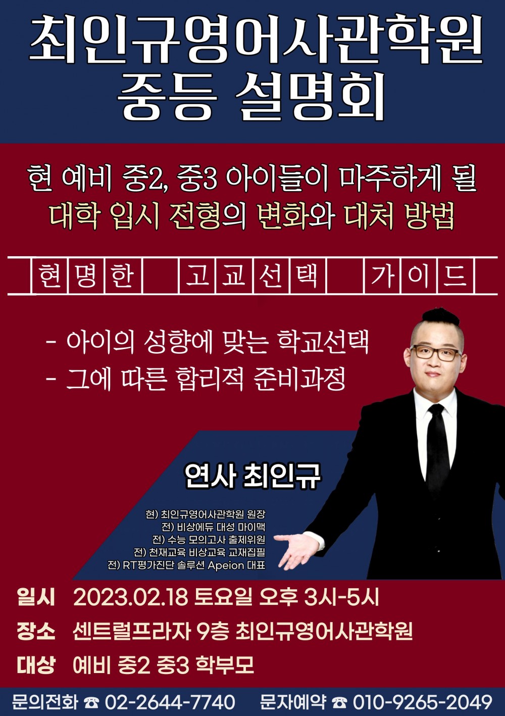 [최인규영어사관학원] 중등 - 입시 - 설명회 페이지 정보 작성자 최인규영어사관학원 댓글 0건 조회 4,862회 작성일 23-02-10 16:21 본문 학원정보 최인규영어사관학원 02-2644-7740 전화문의 위치 양천구 목동 서로 349 센트럴프라자 9층 905 906호 대상 중등 고등 과목 영어 수업목적 내신/심화/선행 수능 지도보기 관심학원 담기 목록 이전글[파피루스문해원] 2023년 중간고사 내신 개강 및 간담회 안내 23.02.10 다음글하이스트 - 상위 0.1%를 위한 과학 프로그램 23.02.09 댓글목록 댓글목록 등록된 댓글이 없습니다.