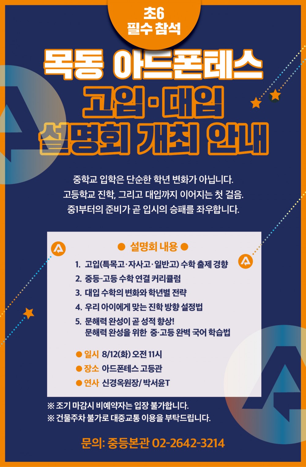 [아드폰테스] 중등본관, 초6 대상 '고입.대입 설명회' 개최 안내