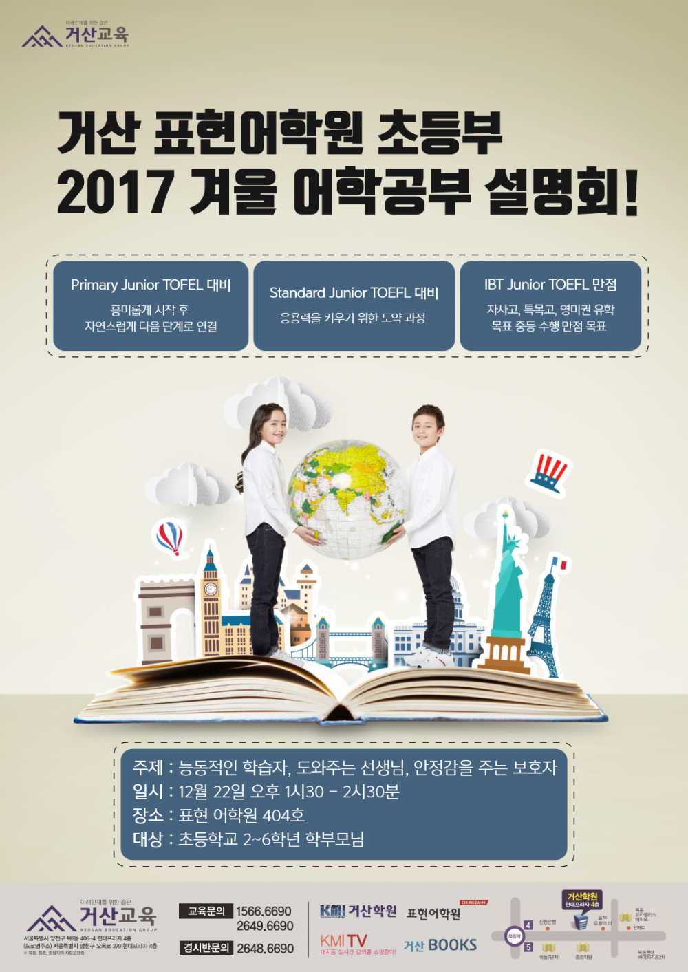 [표현어학원]겨울학기 초등부 설명회 페이지 정보 작성자 표현어학원 댓글 0건 조회 4,407회 작성일 16-12-07 21:28 본문 학원정보 청담표현어학원 02-2645-0553 전화문의 위치 양천구 오목로 279 현대프라자 4층 대상 초등 중등 과목 영어 수업목적 영재원/국제중 영재/특목/자율고 내신/심화/선행 수능 유학 지도보기 관심학원 담기 목록 이전글[표현어학원]초중 영어정규 시간표 16.12.07 다음글<학원회원 필독!> 학원 정보는 한번에 2개까지만 업로드 가능합니다! 16.12.07 댓글목록 댓글목록 등록된 댓글이 없습니다.